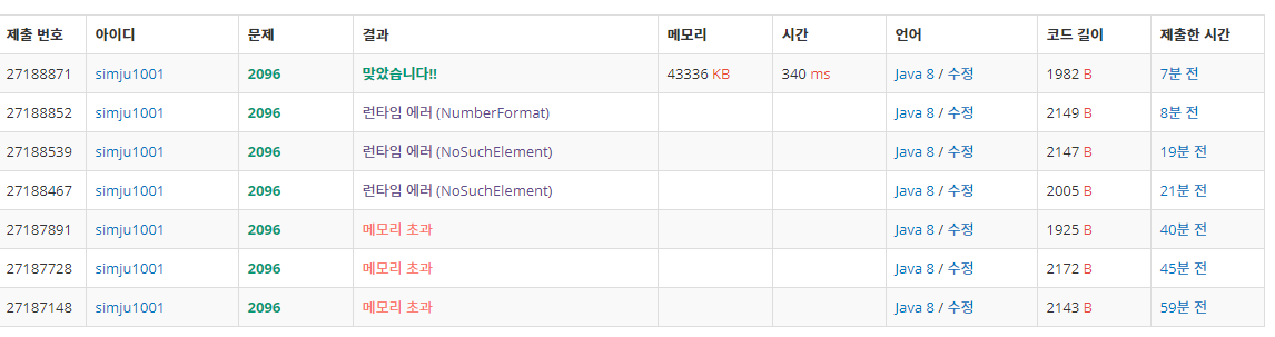 2. 하지만 이 문제는 메모리 제한이 있다. 나는 얼마나 줄여야 메모리 초과가 안날지 궁금해서 가장 처음 떠오르는 방법부터 차근차근 해봤었다. 그리고 나는 이 문제의 행이 3개로 고정 되어있다는 걸 나중에 알았다.(문제 잘읽자 제발!!!) 아래에 적는 것 중에 열 부분의 N을 3이라 생각하고 봐주시길 바란다. (런타임 에러 이유 표시가 안됐다면 지옥이지 않았을까)