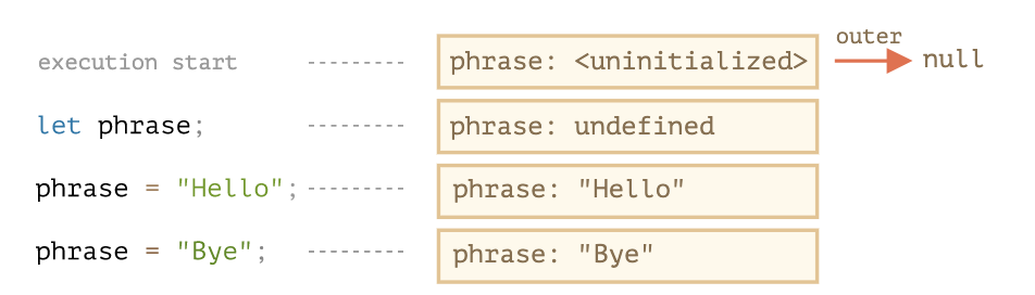 - let 이 나타났다! 값을 아직 할당하지 않았기 때문에 phrase 프로퍼티의 값은 undefined 이다. pharse 는 이 시점 이후부터 참조될 수 있다.